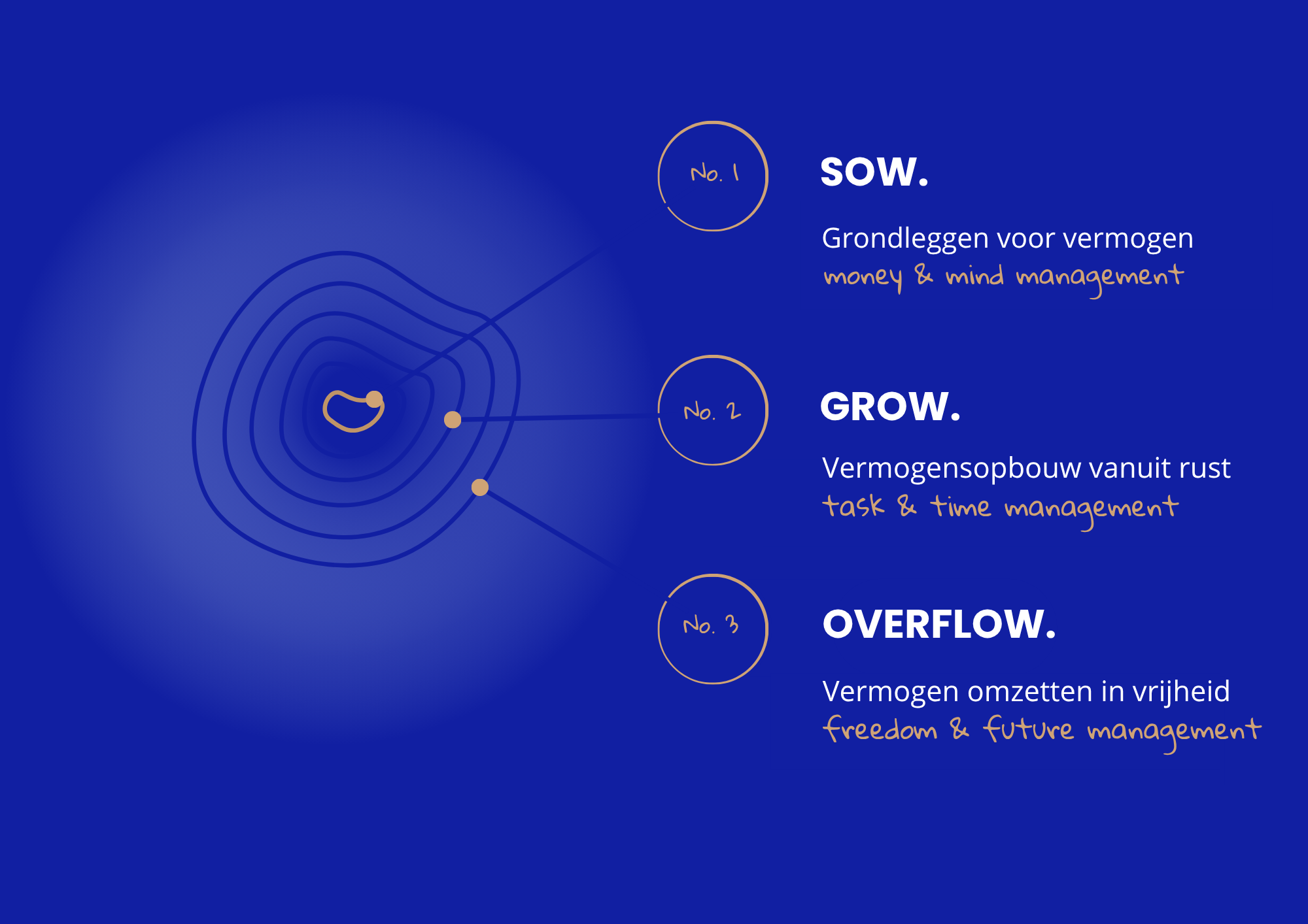 Onze methode, 3 fases, één doel: Samen ervoor zorgen dat jij niet meer al je tijd en energie hoeft te geven aan rennen voor je geld. Wij willen vrijheid voor jou, én zien wat je te geven hebt — dat wat pas aan het licht komt als daar financiële rust en ruimte voor is. Op basis van drie fases zetten we stappen:
